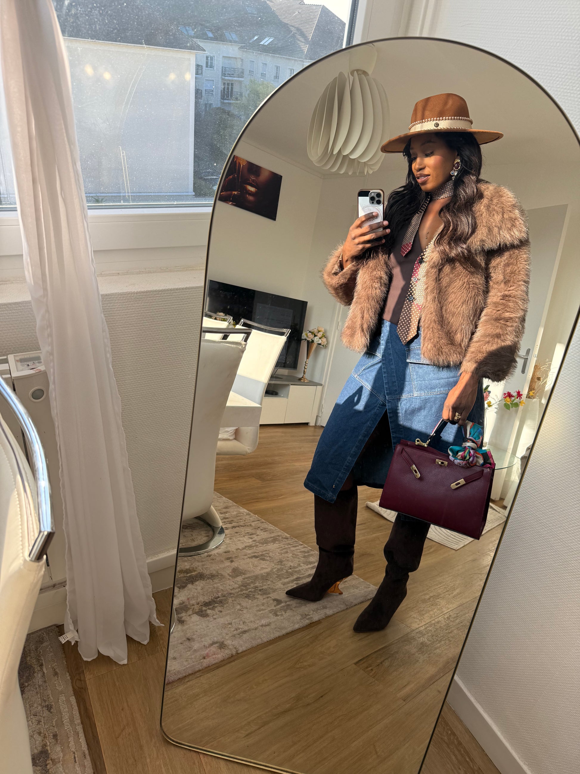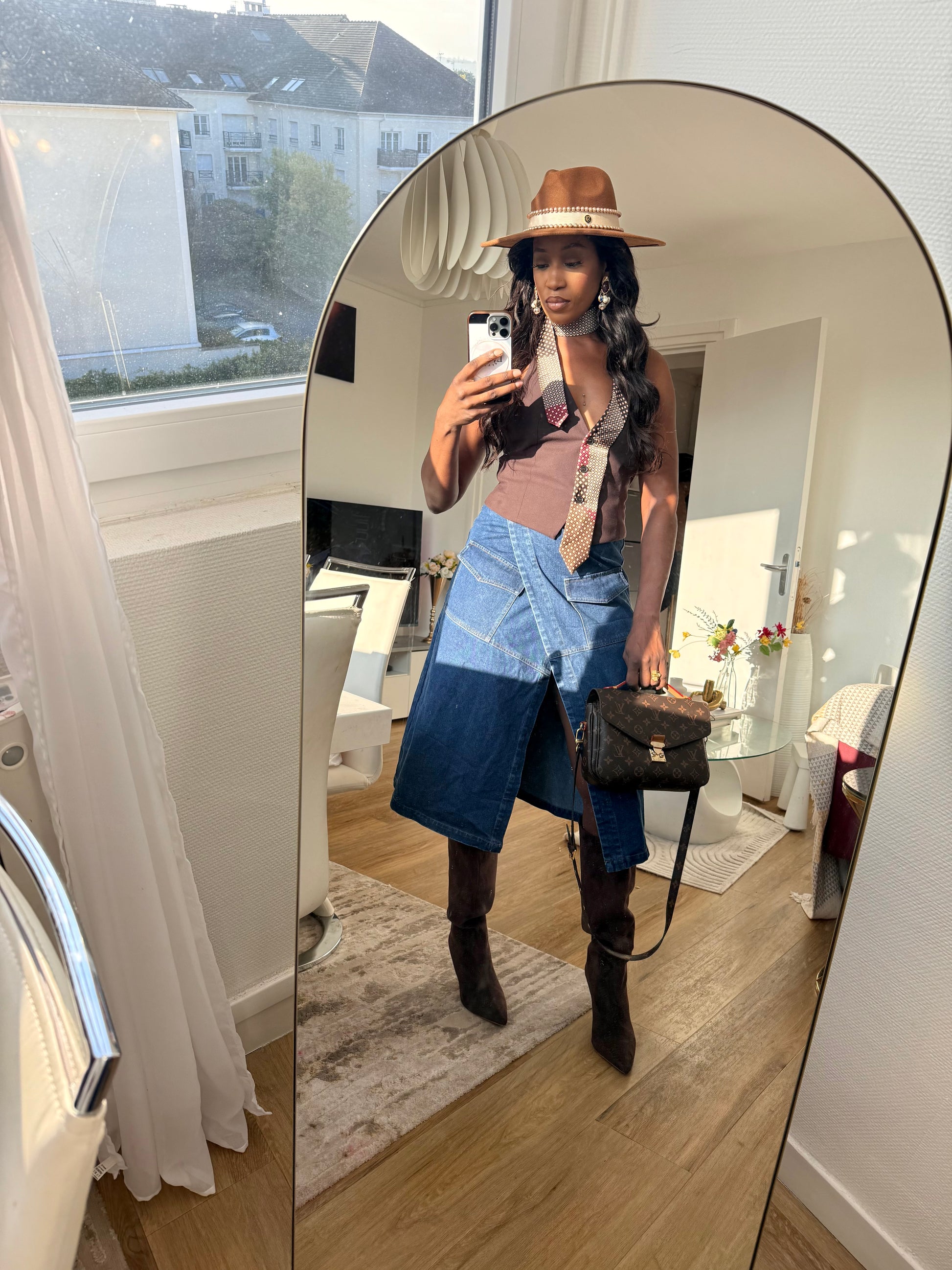 Jolie jupe porté feuille en jean. Très élégante et classe.portée avec des bottes ou des mocassins vous aurez fière allure