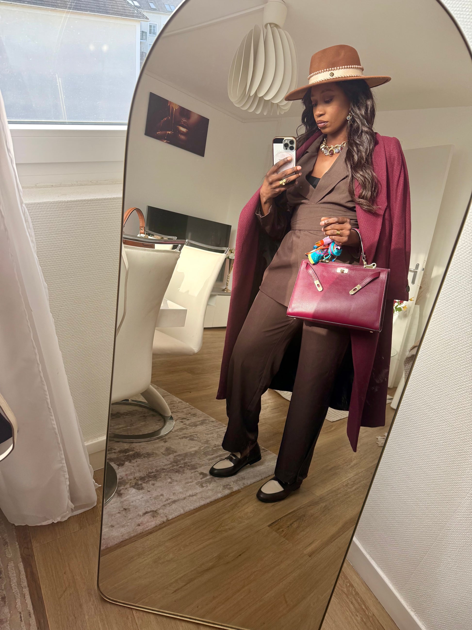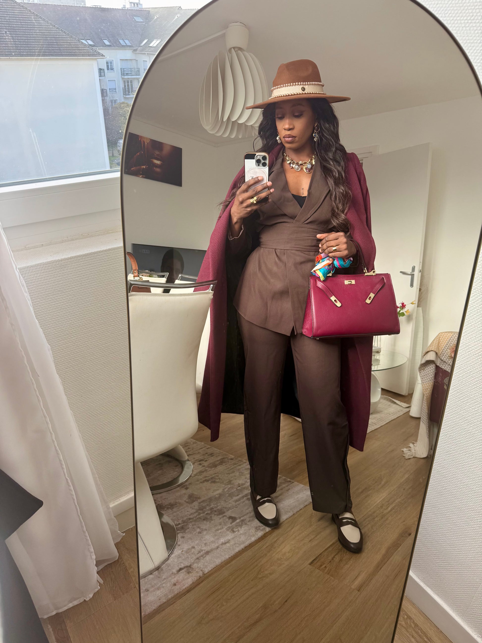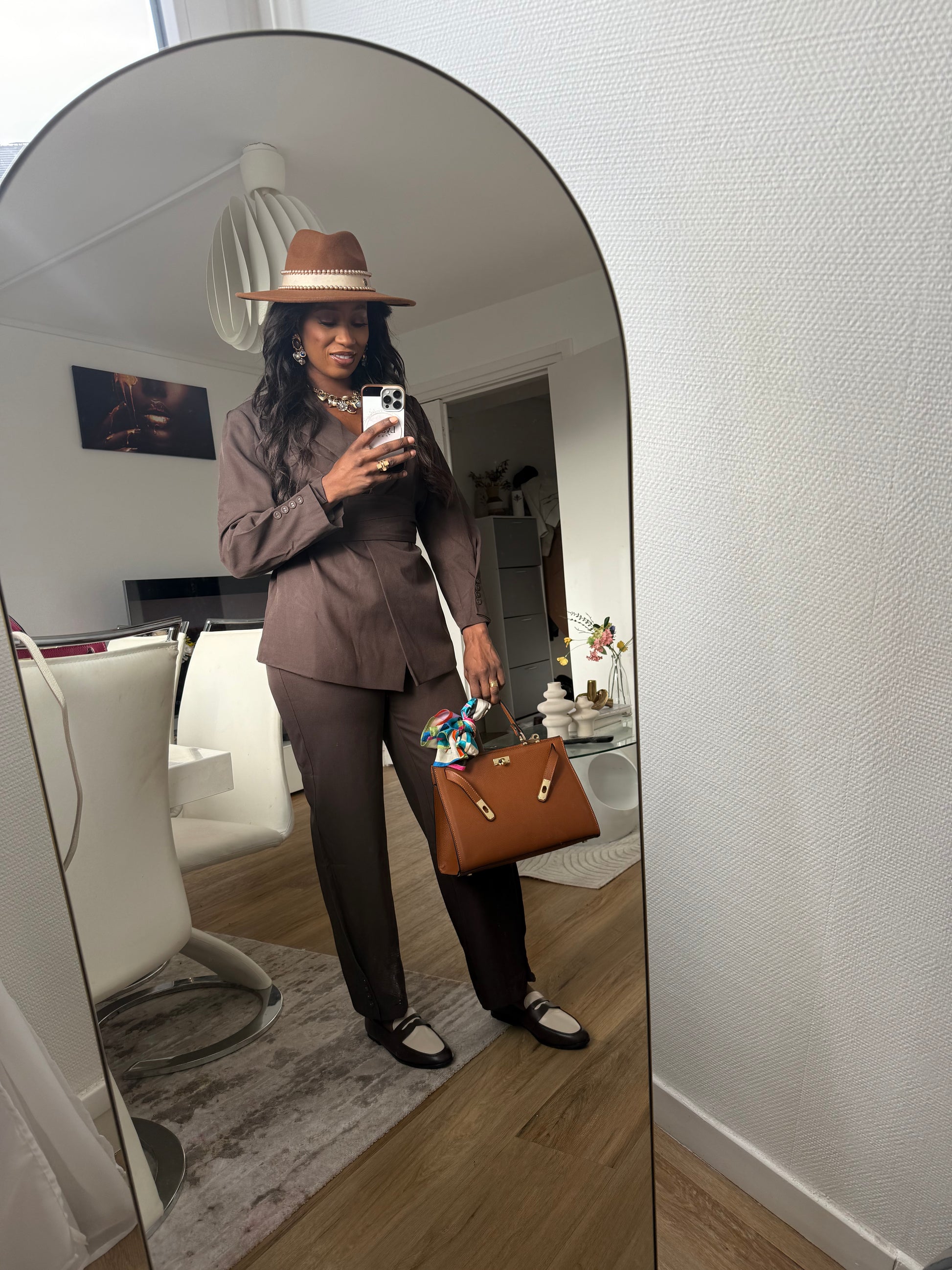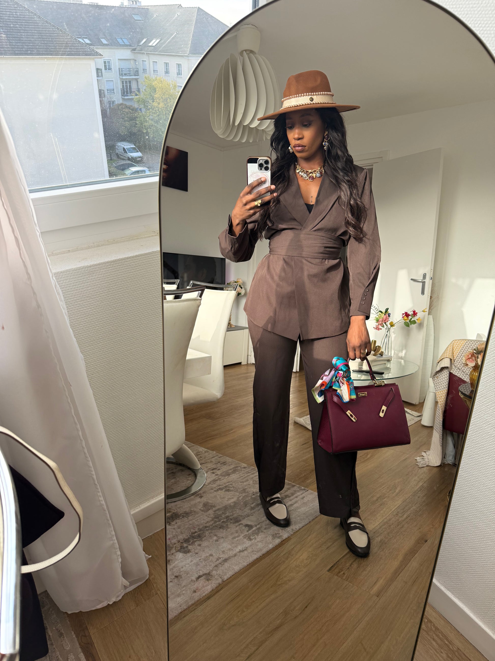 Jolie pantalon marron chocolat avec en détails des boutons latéraux dans le bas du pantalon