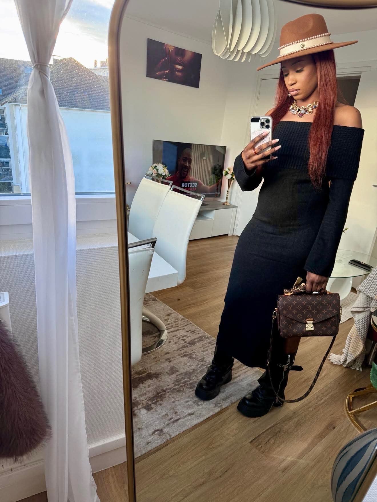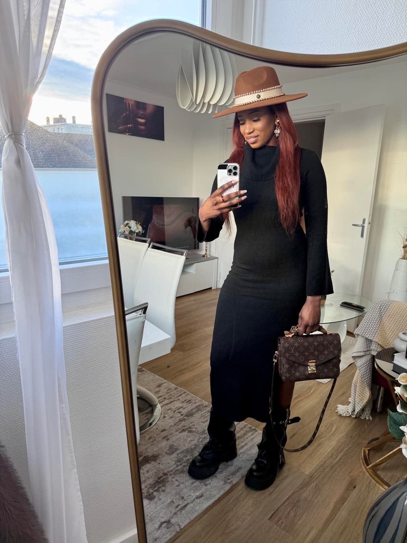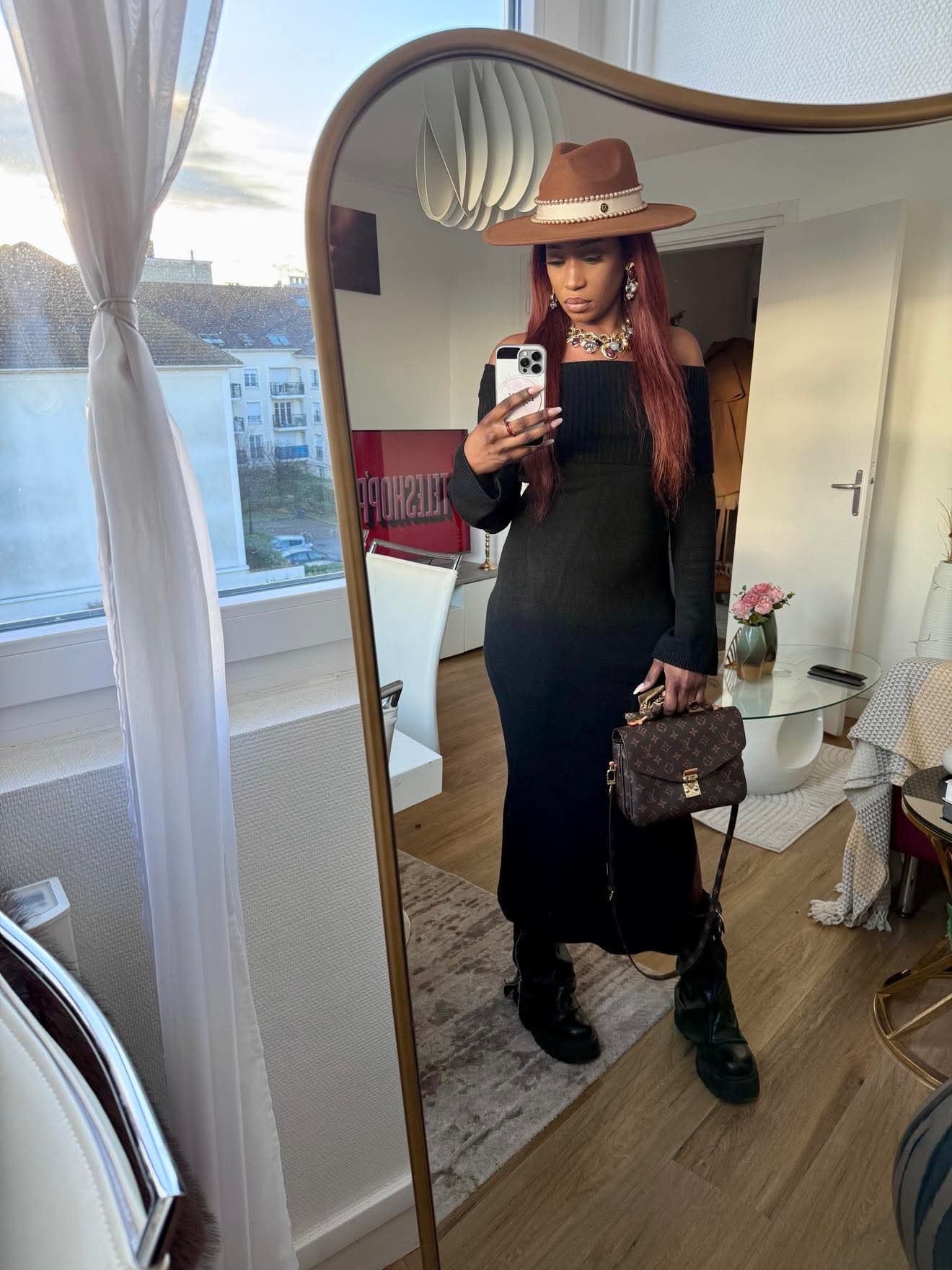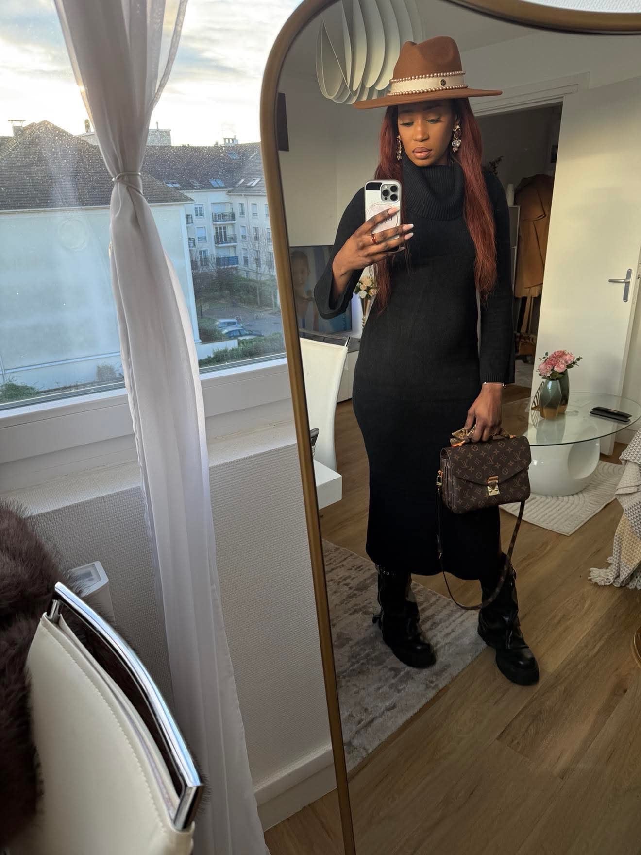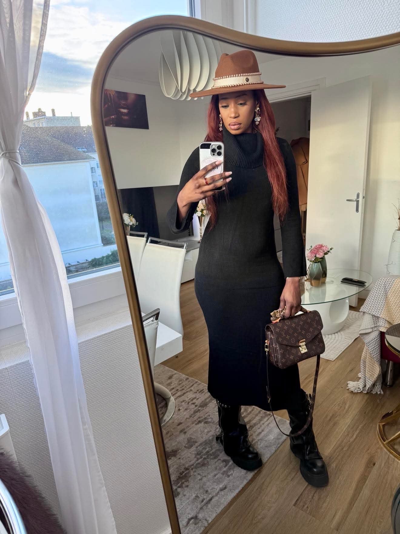 Élégance robe pull avec col bateau. Possible de le porter de différentes façons